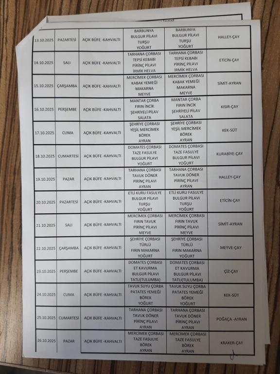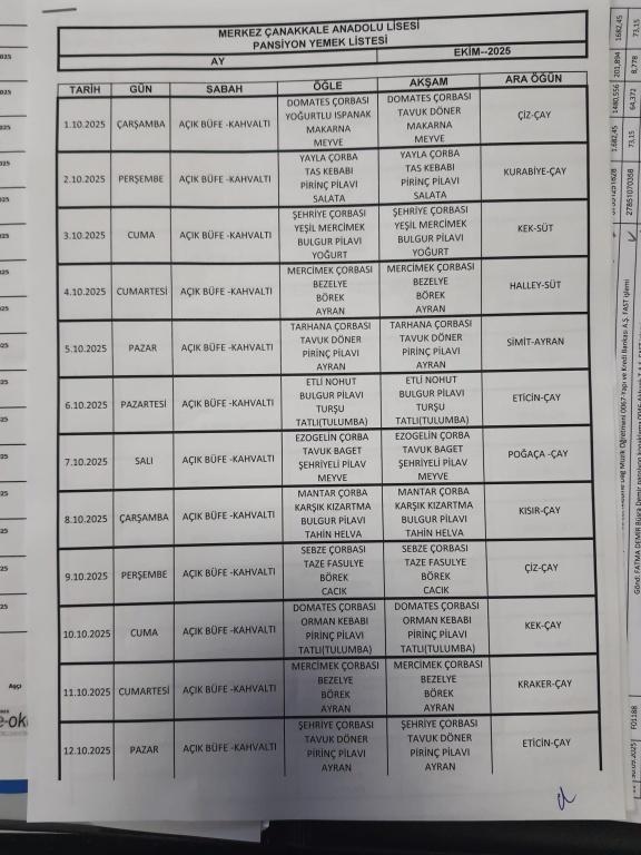 Okulumuz pansiyonunda ekim ayında çıkacak yemek listesi aşağıdaki fotoğraflarda bulunmaktadır. Öğle arasında yemek yiyecek öğrenciler bu listeden günlük menüyü görebilirler.